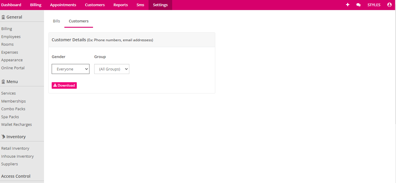 To download - Go to settings - select Downloads - Click on Customers- Select the customer by Gender and Groups and lick on Download